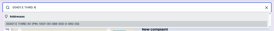 Using the search text field, type in the address of the property. Any matching addresses are displayed in the list below the address search field. Select the address row of the correct location.