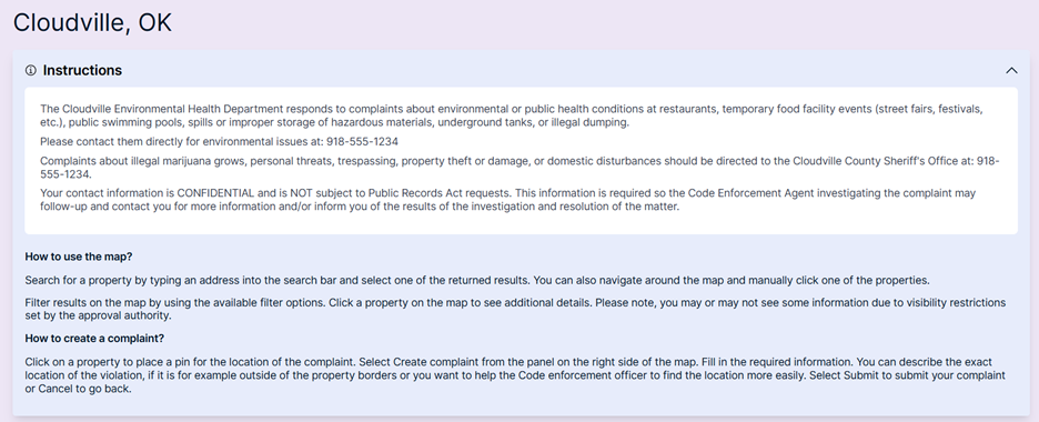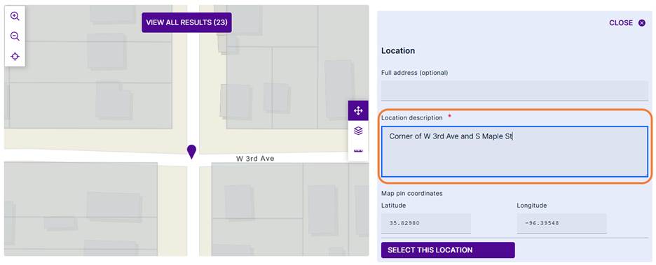 If the location cannot be found or is not on a parcel, the property location description can input manually by selecting the location on the map and inputting the location description.